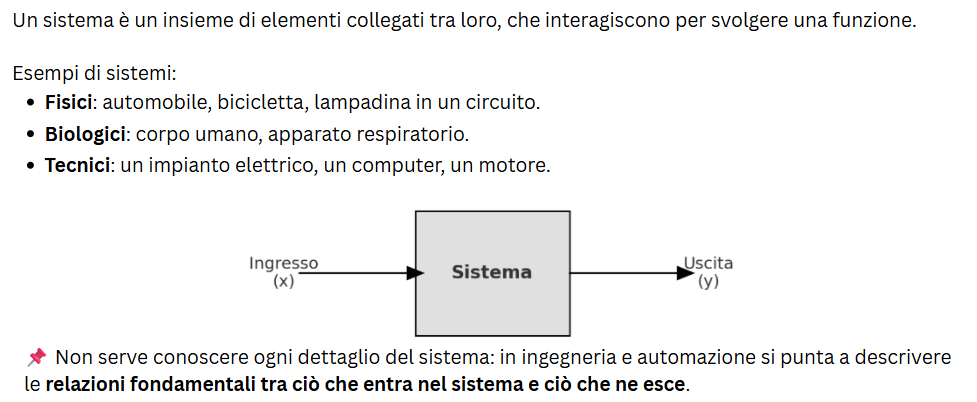 Quando parliamo di un sistema, intendiamo un insieme di elementi collegati tra loro, che interagiscono per svolgere una funzione ben precisa. Pensate a un’automobile: non è solo un motore, o solo le ruote, ma l’insieme di tante parti che collaborano. Oppure al corpo umano: cuore, polmoni, sistema nervoso… sono tanti sottosistemi che lavorano insieme. Lo stesso concetto si applica anche in tecnologia: un computer, un impianto elettrico, un motore.