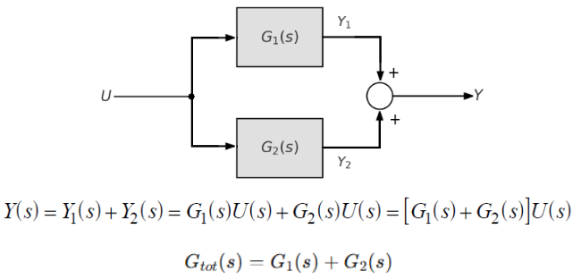 Se i due blocchi sono 𝐺1(𝑠) e 𝐺2(𝑠), la funzione di trasferimento totale sarà la somma: 𝐺𝑡𝑜𝑡(𝑠)=𝐺1(𝑠)+𝐺2(𝑠)