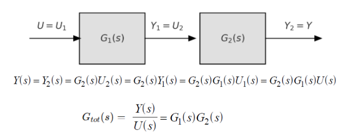 In questo caso, l’uscita del primo blocco diventa l’ingresso del secondo, e così via. Se indichiamo con 𝐺1(𝑠) e 𝐺2(𝑠) i due blocchi, la funzione di trasferimento complessiva sarà data dal loro prodotto: 𝐺𝑡𝑜𝑡(𝑠)=𝐺1(𝑠)⋅𝐺2(𝑠)